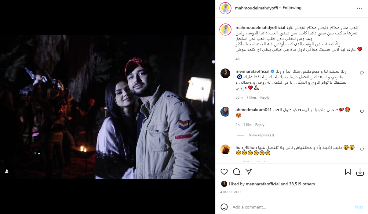 ونشر محمود المهدي صورة تجمعه بـ منة عرفة، عبر حسابه الشخصي على موقع تبادل الصور والفيديوهات القصيرة انستجرام، معلقًا: الحب مش محتاج فلوس محتاج نفوس نقية عمرها ما كانت مين سبق دائمًا كانت مين صدق، الحب دائمًا للأوفياء، ولمن وعد ومن أغطى دون طلب، الحب لمن استحق ولأنك جئت في الوقت الذي كنت أرفض فيه الحب، أحببتك أكتر، عارفه ليه لأني حسيت معاكي لأول مرة في حياتي يعني إيه كلمة عوض.