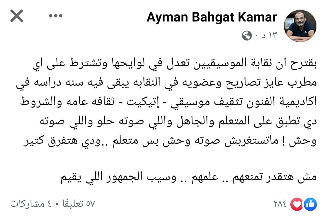 وكتب أيمن بهجت قمر منشورًا، عبر حسابه الشخصي بموقع التواصل الاجتماعي فيس بوك، قائلًا: بقترح أن نقابة الموسيقيين تعدل في لوايحها، وتشترط على أي مطرب عايز تصاريح، وعضوية في النقابة يبقى فيه سنة دراسة في أكاديمية الفنون، تثقيف موسيقي وإتيكيت وثقافة عامة.