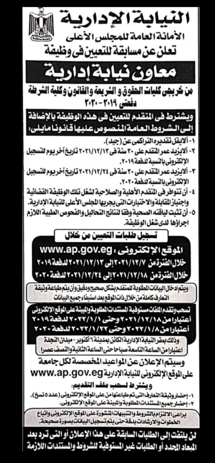 ومن ناحية أخرى، أعلنت النيابة الإدارية مسابقة للتعيين في وظيفة معاون نيابة إدارية من خريجي كليات الحقوق والشريعة والقانون والشرطة من دفعتي 2019 و2020.