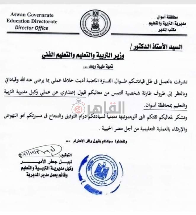 الدكتور وزير التربية والتعليم والتعليم الفني، تشرفت بالعمل في ظل قيادتكم طوال الفترة الماضية أديت خلالها عملي بما يرضى عنه الله وقياداتي وبالنظر إلى ظروف طارئة شخصية التمس من معاليكم قبول اعتذاري عن عملي وكيل مديرية التربية والتعليم بمحافظة أسوان.