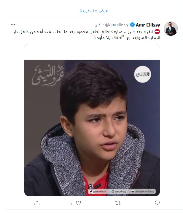 أثارت حلقة الإعلامي عمرو الليثي مع الطفل محمود حالة واسعة من التعاطف خلال الساعات الماضية مع الطفل بعدما سرد التفاصيل الكاملة لأزمته والتخلي عنه من قبل والدته بعد زواجها من رجل آخر بعد وفاة والده، وتعرضه للاعتداء البدني من جانب أقاربه، حيث عبر عدد كبير من مستخدمي مواقع التواصل الاجتماعي عن تعاطفهم مع محمود وأبدى آخرون استعدادهم لاستضافته ورعايته.
