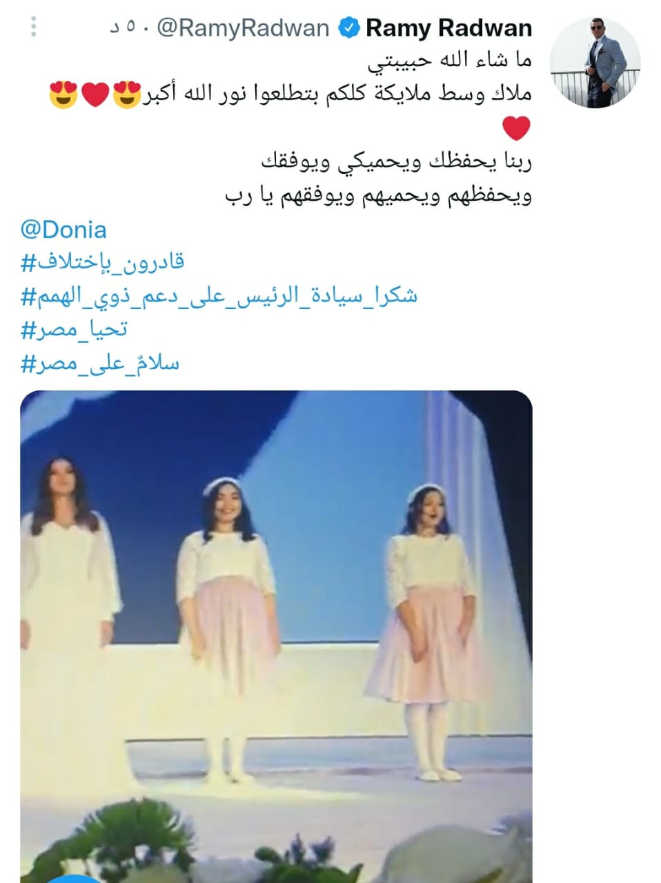 وكتب الإعلامي رامي رضوان تغريدة، عبر حسابه الشخصي بموقع التدوينات القصيرة تويتر: ماشاء الله حبيبتي ملاك وسط وملائكة، كلكم بتطلعوا نور الله أكبر، ربنا يحفظك ويحميكي ويوفقك، ويحفظهم ويحميهم ويوفقهم يارب.