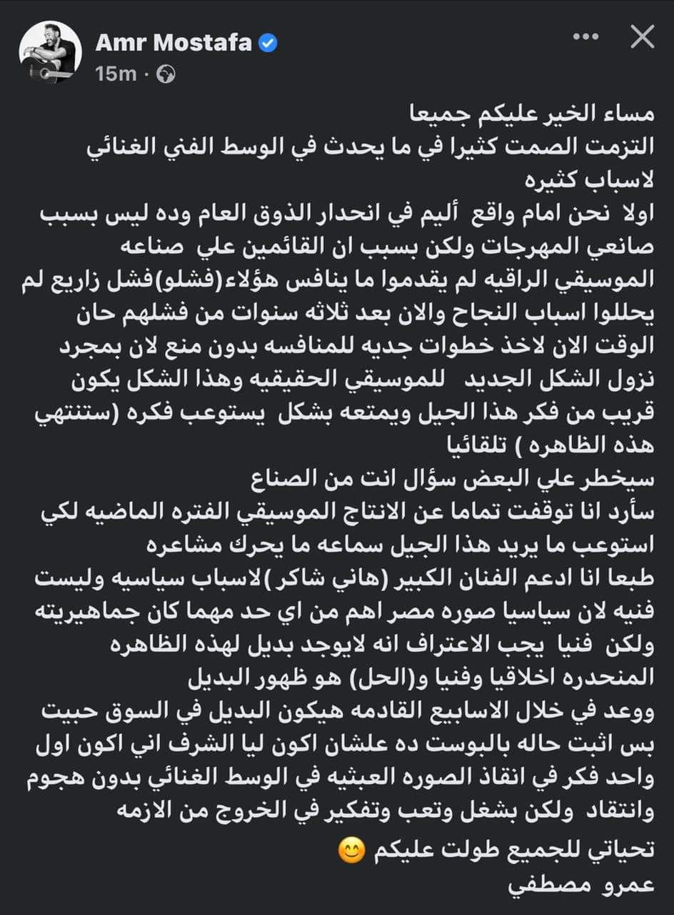 وكتب عمرو مصطفى، منشورًا عبر حسابه الشخصي بموقع التواصل الاجتماعي فيسبوك: مساء الخير عليكم جميعا.. التزمت الصمت كثيرًا فيما يحدث في الوسط الفني الغنائي لأسباب كثيرة.. أولا نحن أمام واقع أليم في انحدار الذوق العام وده ليس بسبب صانعي المهرجات، ولكن بسبب أن القائمين على صناعة الموسيقى الراقية لم يقدموا ما ينافس هؤلاء، فشلوا فشلا ذريعا، لم يحللوا أسباب النجاح والآن بعد ثلاث سنوات من فشلهم حان الوقت الآن لأخذ خطوات جدية للمنافسة دون منع، لأنه بمجرد نزول الشكل الجديد للموسيقى الحقيقية، فهذا الشكل يكون قريبا من فكر هذا الجيل ويمتعه بشكل يستوعب فكره ستنتهي هذه الظاهرة تلقائيا.