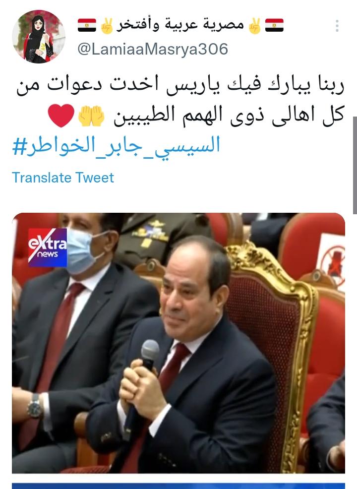 وقال إسلام: اللحظة ديه مثلا، ضحكة عزيز مصر من القلب لملائكة مصر، وكتب محمد: أمي كلمتني الصبح وبتقولي ربنا يبارك في السيسي، مشوفتش رئيس بيعمل كدة في الدنيا، ربنا يحفظه ويبارك فيه، أحلى دعوات من قلب أم ليك يا حبيب المصريين.