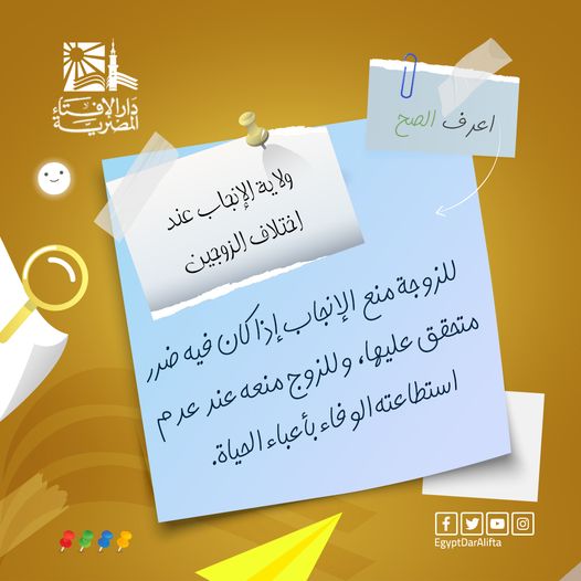 وقالت الدار، عبر حسابه على موقع التواصل الاجتماعي فيس بوك، إنه من المقرر شرعًا أن إنجاب الأولاد، حق مشترك بين الزوجين، فإذا تراضيا على تركه مدة لعذر، كتربية الأولاد، ورعايتهم جاز لهما ذلك بالتراضي، ولا يجوز لهما منعه مطلقًا إلا لعذر ككونه فيه ضرر متحقق على حياة الأم، أو الجنين.