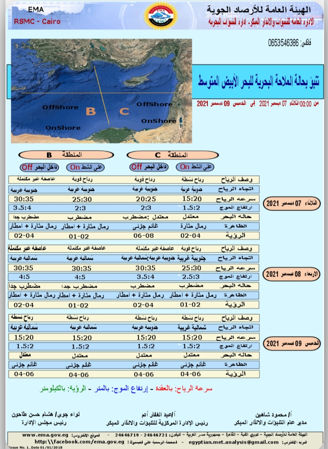 وحذر بيان الهيئة من حالة عدم الاستقرار في البحر المتوسط ونشاط الرياح القوية التي تصل سرعتها إلى 70 كم / الساعة، وأشار إلى ارتفاع الأمواج بقيم تتراوح بين 3.5: 5 أمتار على البحر المتوسط، يومي الثلاثاء والأربعاء، على أن تنتهي يوم الخميس المقبل.