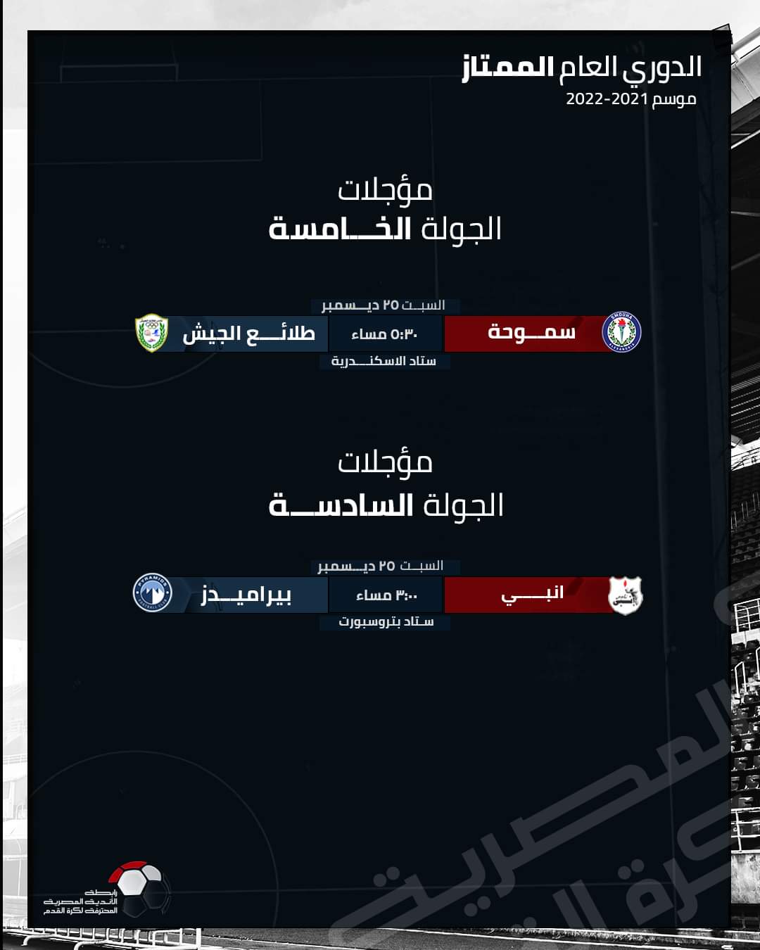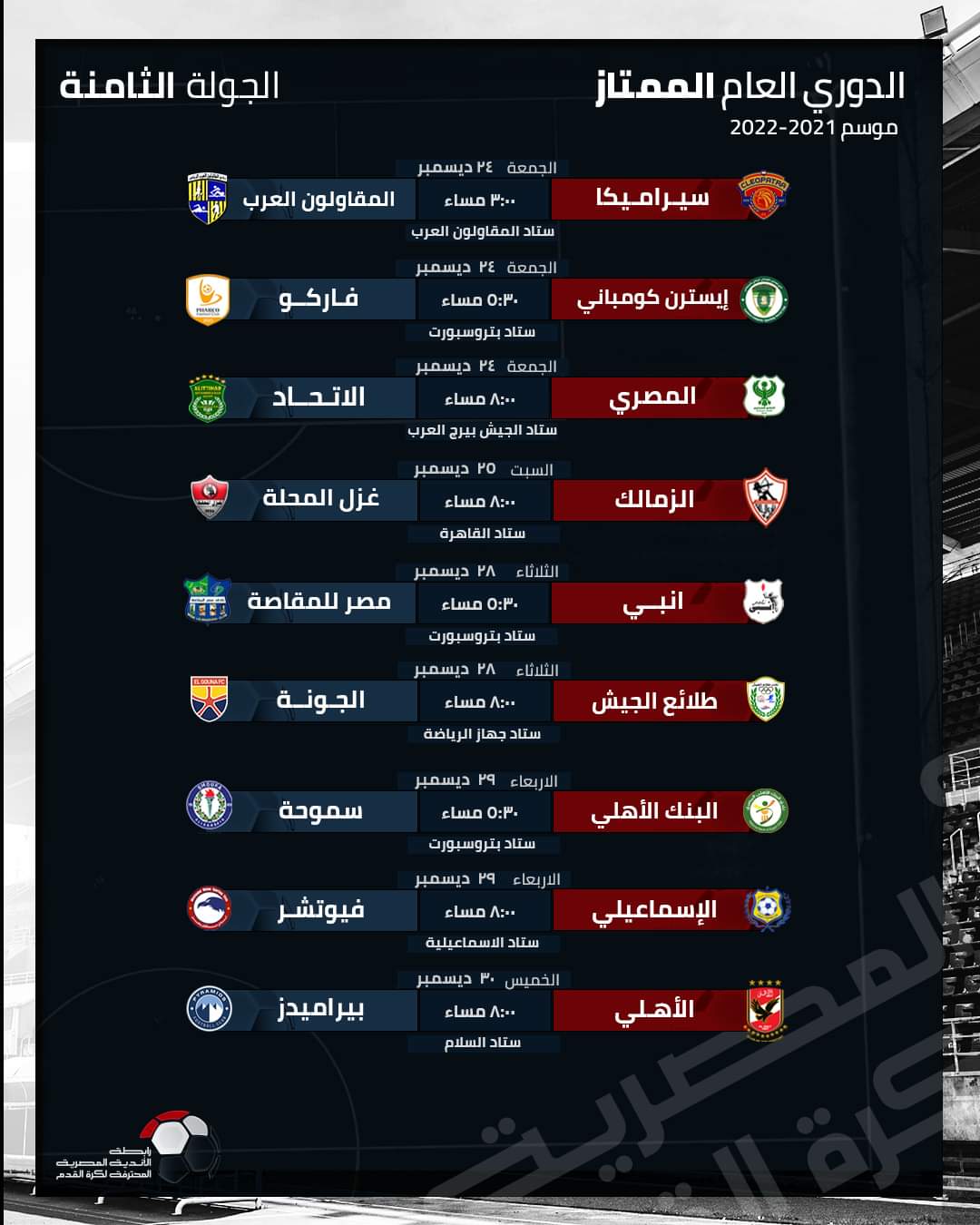 ويواجه الأهلي نظيره بيراميدز يوم 30 ديسمبر ضمن مباريات الجولة الثامنة بالمسابقة، بينما الزمالك سيواجه غزل المحلة يوم 25 ديسمبر، على أن يتم تحديد الموقف النهائي لبعض المباريات طبقًا للارتباطات القارية.