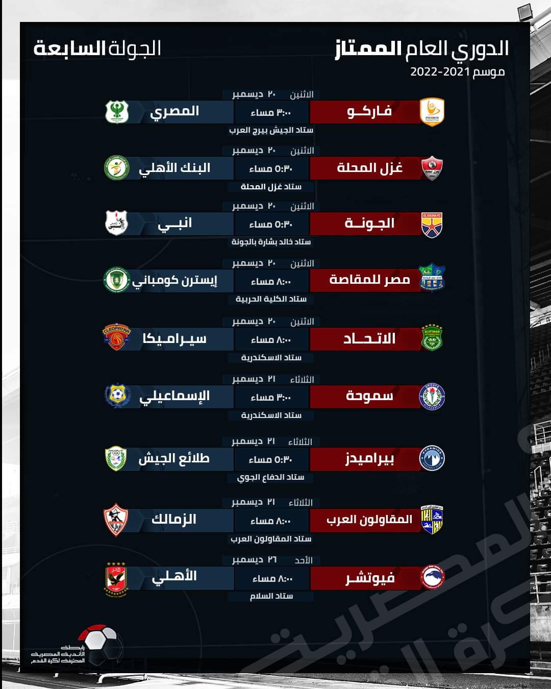 ويواجه فريق الأهلي نظيره فيوتشر يوم 26 ديسمبر ضمن مباريات الجولة السابعة، من مسابقة الدوري الممتاز، بينما يواجه الزمالك نظيره المقاولون العرب يوم 21 ديسمبر.