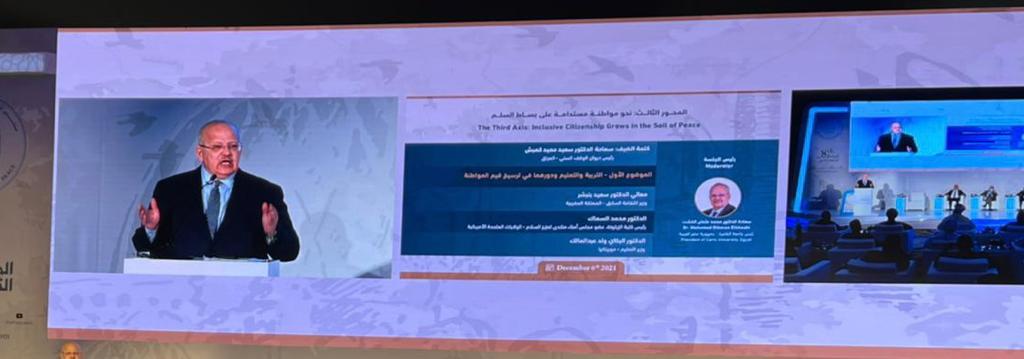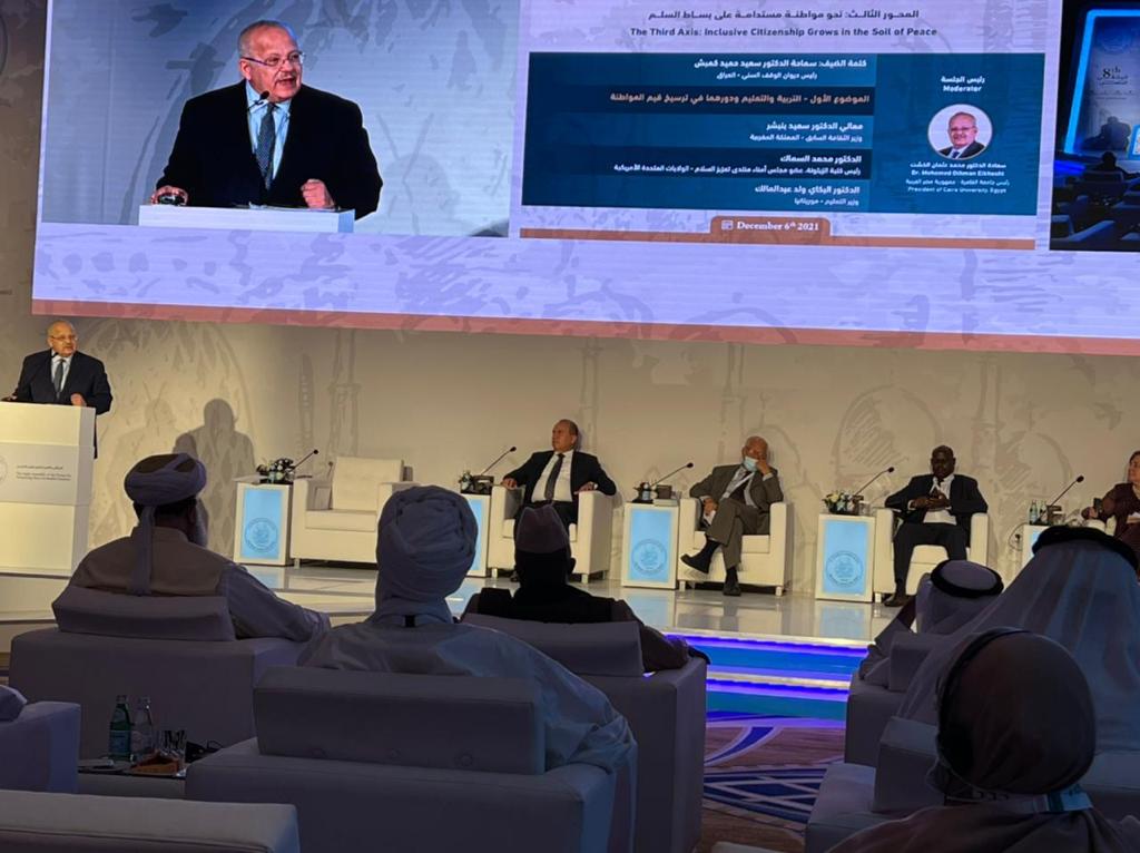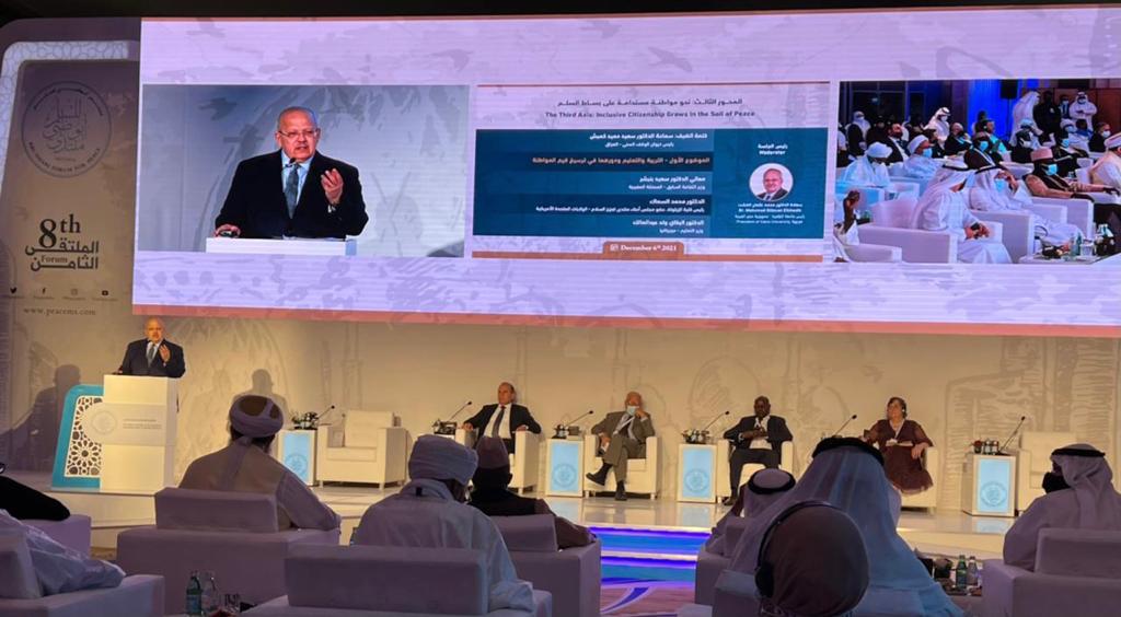 ترأس الدكتور محمد عثمان الخشت أستاذ فلسفة الدين ورئيس جامعة القاهرة، جلسة بعنوان نحو مواطنة مستدامة على بساط السلم، ضمن فعاليات الملتقى الثامن لمنتدى تعزيز السلم في المجتمعات المسلمة المواطنة الشاملة من الوجود المشترك إلى الوجدان المتشارك، والذي عقد بدولة الإمارات، خلال الفترة من 5 وحتى 7 ديسمبر 2021، تحت رعاية الشيخ عبدالله بن زايد آل نهيان وزير الخارجية والتعاون الدولي بالإمارات، ورئاسة الشيخ عبدالله بن بيه رئيس منتدى تعزيز السلم ورئيس مجلس الإمارات للإفتاء الشرعي، وبمشاركة وزراء وممثلي حكومات ومنظمات دولية وشخصيات رفيعة المستوى وعشرات المفكرين والأكاديميين والباحثين وعلماء الدين من مختلف الأديان والمذاهب وبحضور العشرات من الباحثين الشباب.