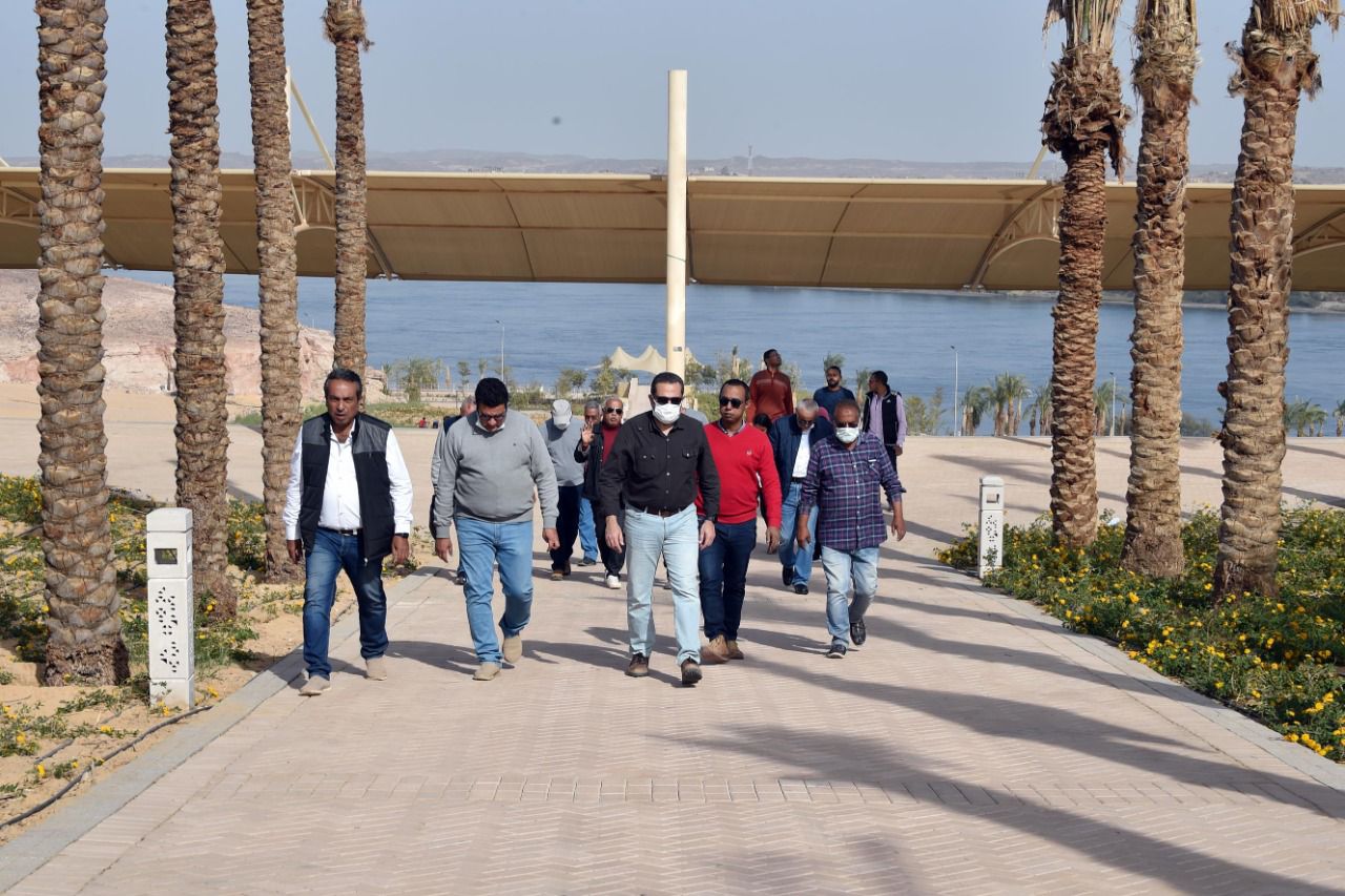 وخلال الجولة، تفقد مسئولو الوزارة، مشروعات الشريط النهري السياحي بالمدينة على مساحة حوالي 1050 فدانا، ويضُم منطقة الفيلات، والممشى السياحي بطول 1500 متر، ومسار للدراجات، ومحال تجارية، وكذا الممشى النيلي بطول 6 كم، ويضم بازارات سياحية - محال تجارية - كافيهات - نفق مشاة - مراسي سياحية - مناطق ألعاب أطفال - مسارات حركة للمشاة - برجولات خشبية - مقاعد للمواطنين - أماكن انتظار السيارات، والمسرح المكشوف بمساحة 5.5 فدان يسع 3000 متفرج بإطلالة بانورامية على نهر النيل وملحق به ساحة انتظار سيارات تسع 300 سيارة، وكباري مشاة، تم تنفيذها للاتصال بين الممشى النيلي ومنطقة الفيلات.
