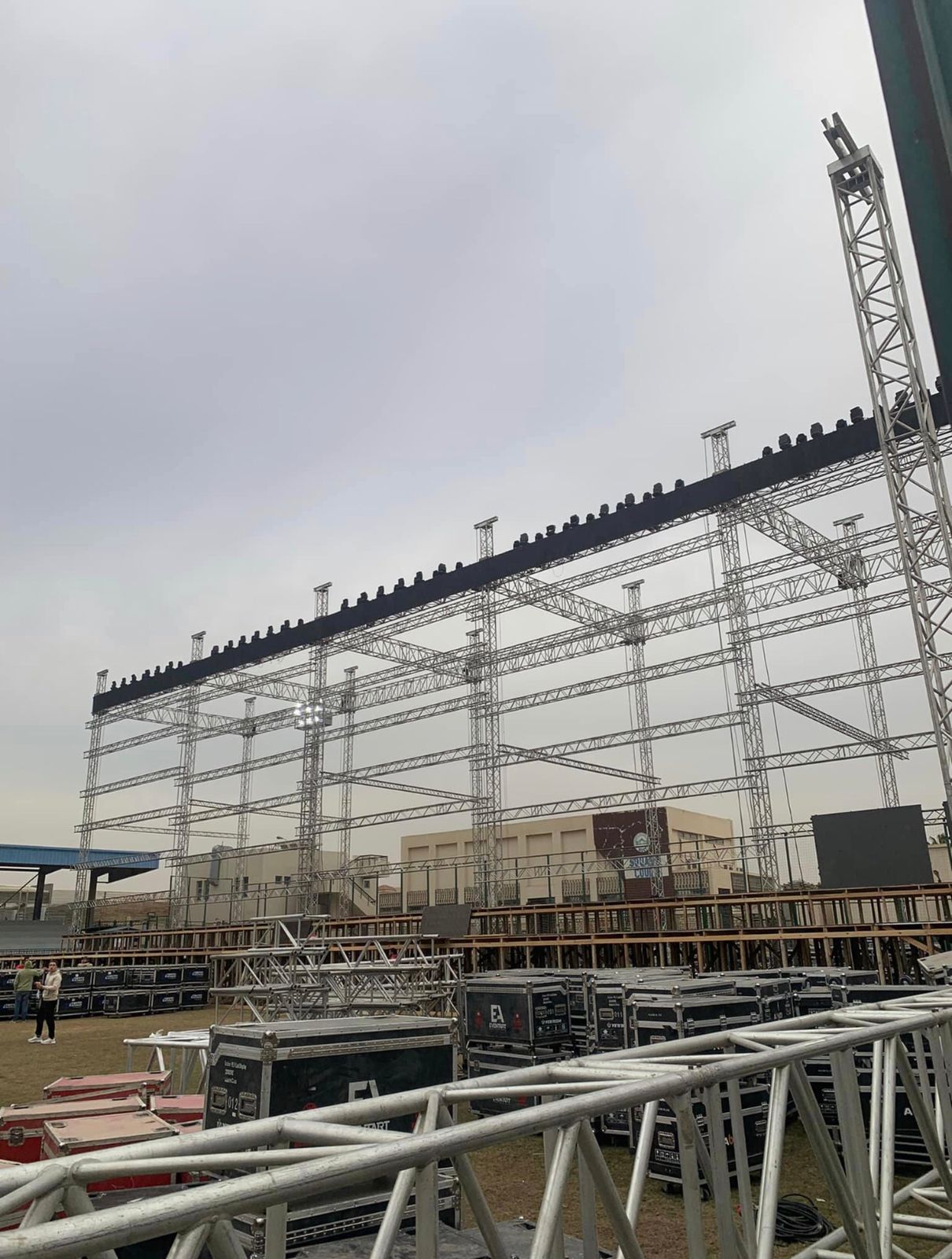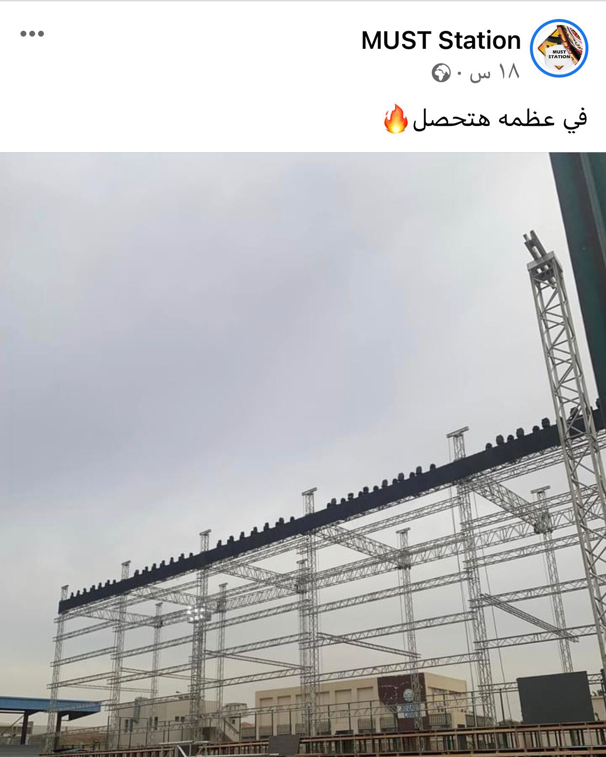 ونشرت الصفحة الرسمية لجامعة مصر للعلوم والتكنولوجيا، صورًا من التجهيزات النهائية لحفل الفنان تامر حسني، والمقرر أن يكون داخل ملعب الحرم الجامعي.