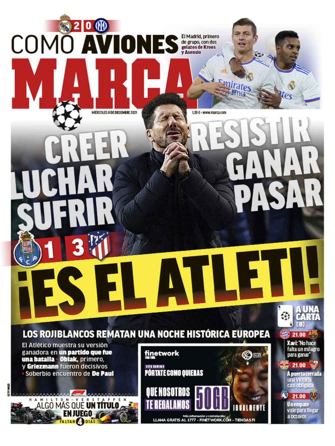 عنونت ماركا في غلافها بالعنوان: "كالطائرات.. ريال مدريد الأول في المجموعة بهدفين من كروس أسينسيو"، كما سلطت الصحيفة الضوء على تأهل أتلتيكو مدريد للدور القادم بصعوبة وسيناريو درامي أمام بورتو.