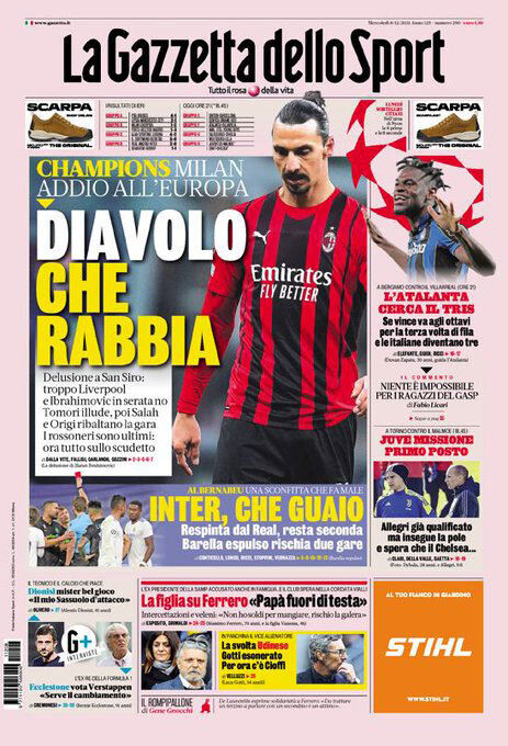 عنونت لا جازيتا في صفحة غلافها بالعنوان: "ميلان يسقط.. غضب الشيطان"، وذلك بعد خروج ميلان من دور المجموعات وفشل تأهله للدوري الأوروبي عقب الخسارة من ليفربول.
