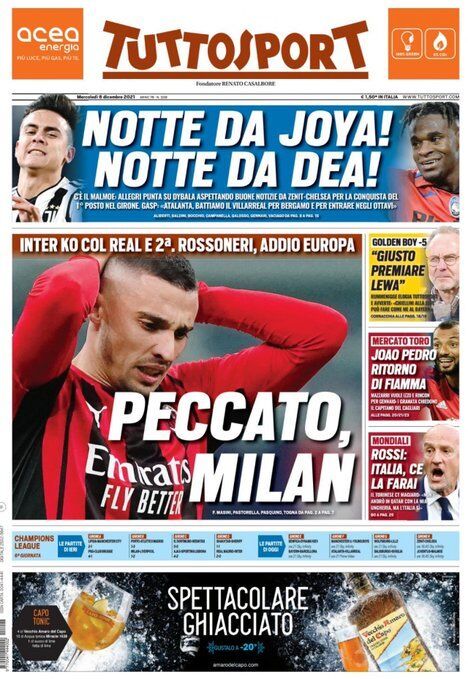 تصدر العنوان: "خطيئة ميلان" غلاف صحيفة توتو سبورت لعدد اليوم، وذلك بعد خسارة ميلان أمس المواجهة ضد ليفربول بهدفين مقابل هدف وتوديع المنافسات الأوروبية لموسم 2021/22.