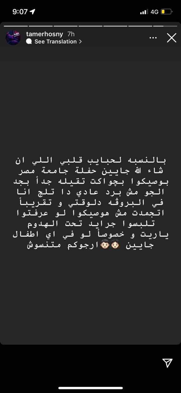 وكتب تامر حسني على حسابه الشخصي بـ إنستجرام، ستوري، قائلًا: بالنسبة لحبايب قلبي اللي إن شاء الله جايين حفلة جامعة مصر، باوصيكوا بجواكيت تقيلة جدًّا بجد، الجو مش برد عادي ده تلج، أنا في البروفة دلوقتي وتقريبًا اتجمدت مش هاوصيكوا لو عرفتوا تلبسوا جرايد تحت الهدوم يا ريت، خصوصًا لو في أي أطفال جايين، أرجوكم ماتنسوش.