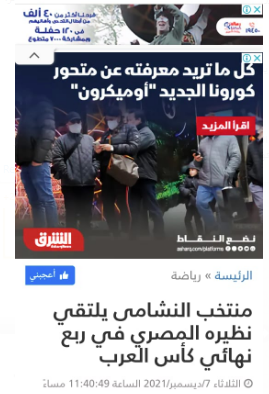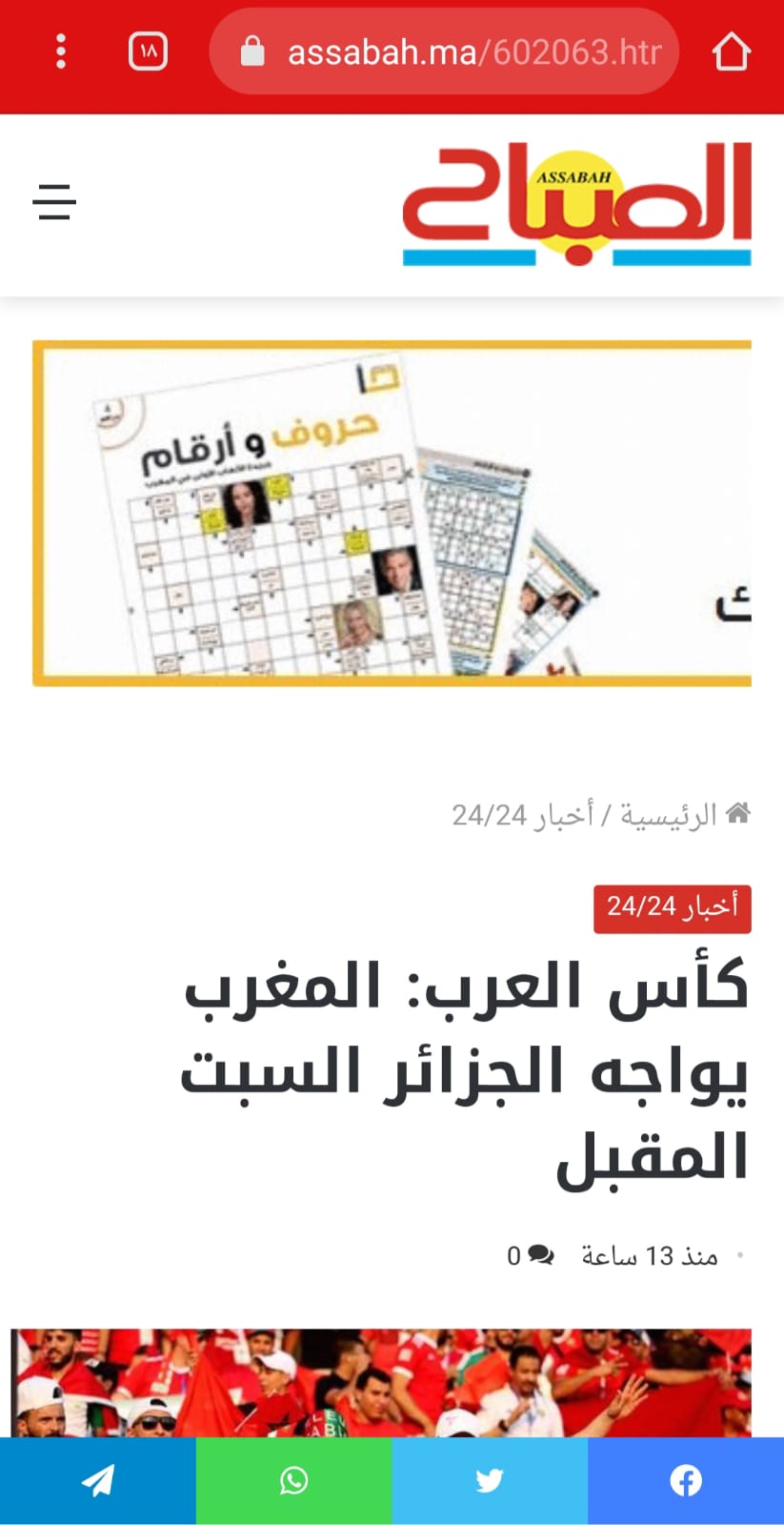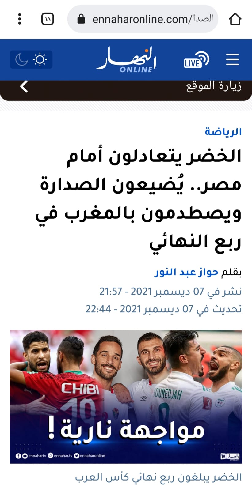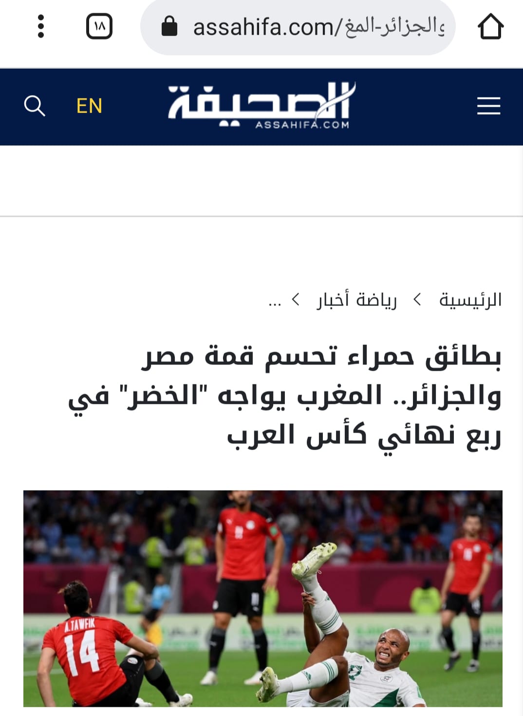 عنونت صحفية الصباح المغربية كأس العرب: المغرب يواجه الجزائر السبت المقبل، بعد تعادل الفراعنة أمام الخضر بهدف لكل منهما.