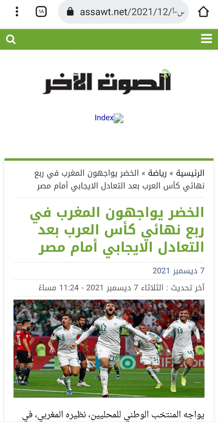 تصدر عنوان "الخضر يواجهون المغرب في ربع نهائي كأس العرب"، جريدة الصوت الأخر الجزائرية، بعد تعادل مصر أمام الجزائر في الجولة الثالثة من دور المجموعات لبطولة كأس العرب.