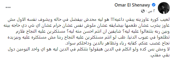 وكتب عمر الشناوي عبر حسابه الشخصي بموقع التواصل الاجتماعي فيسبوك: لعيب كورة عاوزينه يبقى داعية، هو ليه محدش بيفضل في حاله، ويشوف نفسه الأول، مش عاوز يشرب عشان طعمها بيضايقه، عشان ملوش نفس، عشان حرام، عشان أي شيء دي حاجة بينه وبين ربه بتتعالوا عليه ليه.