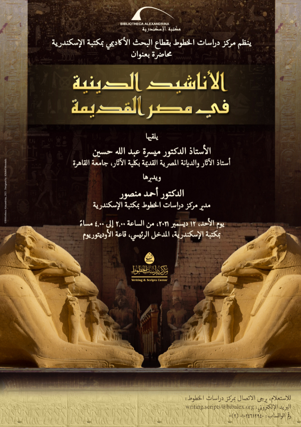 ينظم مركز دراسات الخطوط بمكتبة الإسكندرية محاضرة بعنوان الأناشيد الدينية في مصر القديمة، يحاضر فيها الأستاذ الدكتور ميسرة عبد الله حسين؛ أستاذ الآثار والديانة المصرية القديمة بكلية الآثار جامعة القاهرة، ويدير المحاضرة الدكتور أحمد منصور، مدير مركز دراسات الخطوط بمكتبة الإسكندرية، وذلك يوم الأحد الموافق 12 ديسمبر 2021، من الساعة 2.00 إلى 4.00 مساءً، بقاعة الأوديتوريوم، بمكتبة الإسكندرية.