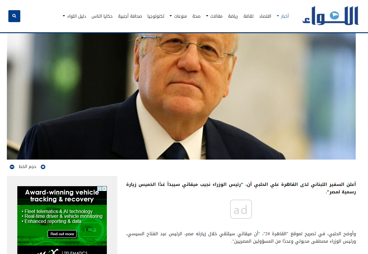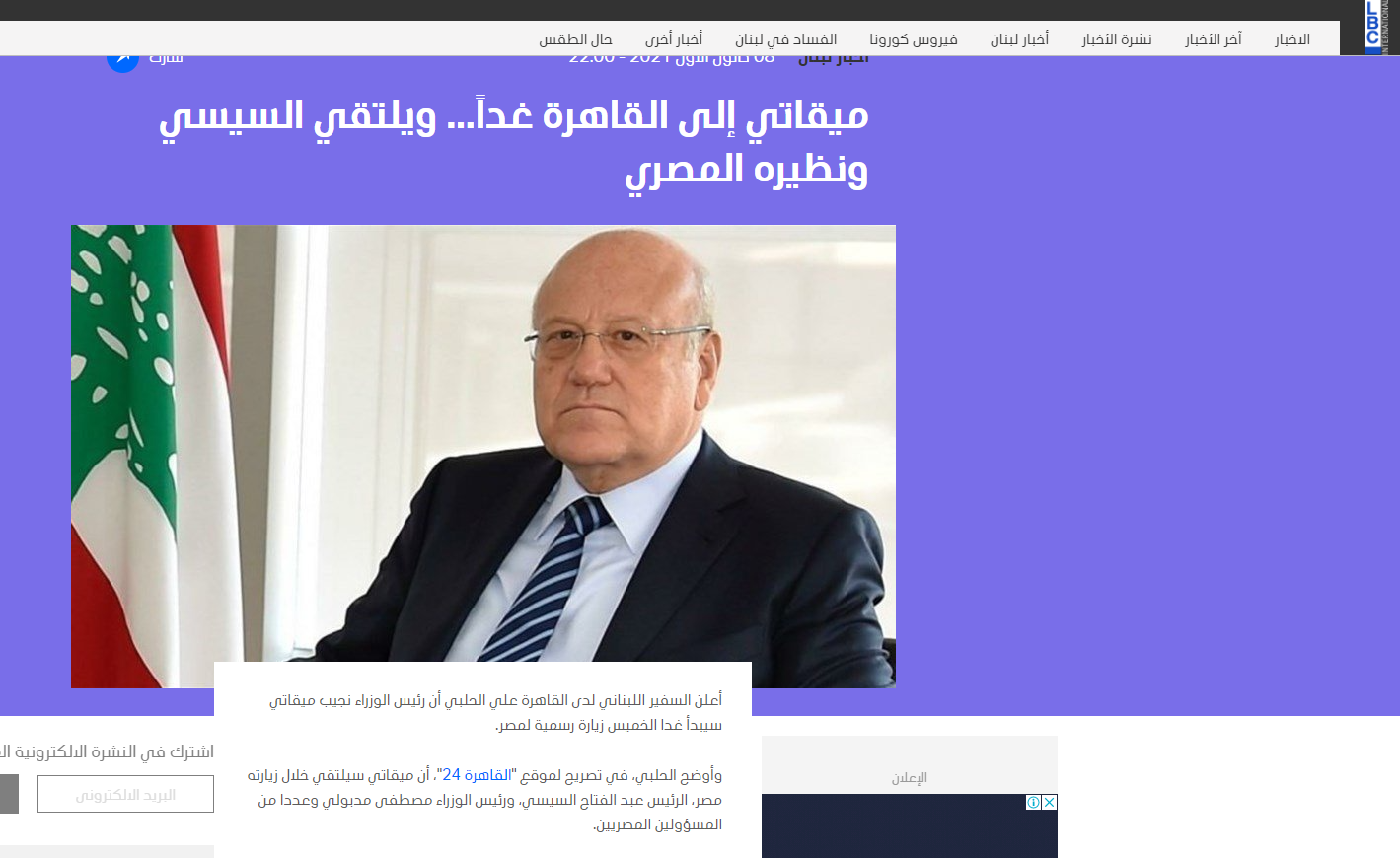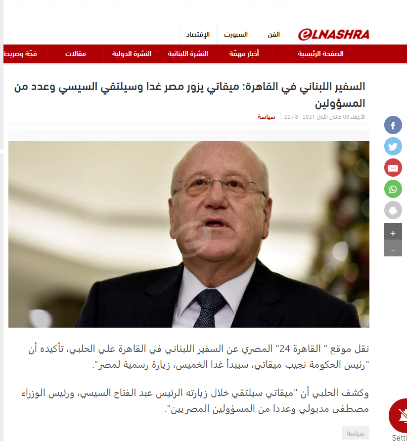 ونقلت وسائل إعلام لبنانية وإقليمية، ما نشره القاهرة 24، نقلا السفير علي الحلبي، سفير لبنان في مصر، بأن ميقاتي، سيبدأ اليوم الخميس، زيارة رسمية لمصر، موضحا أنه سيلتقي بالرئيس السيسي، والدكتور مصطفى مدبولي، رئيس الوزراء، وعدد من المسؤولين المصريين.