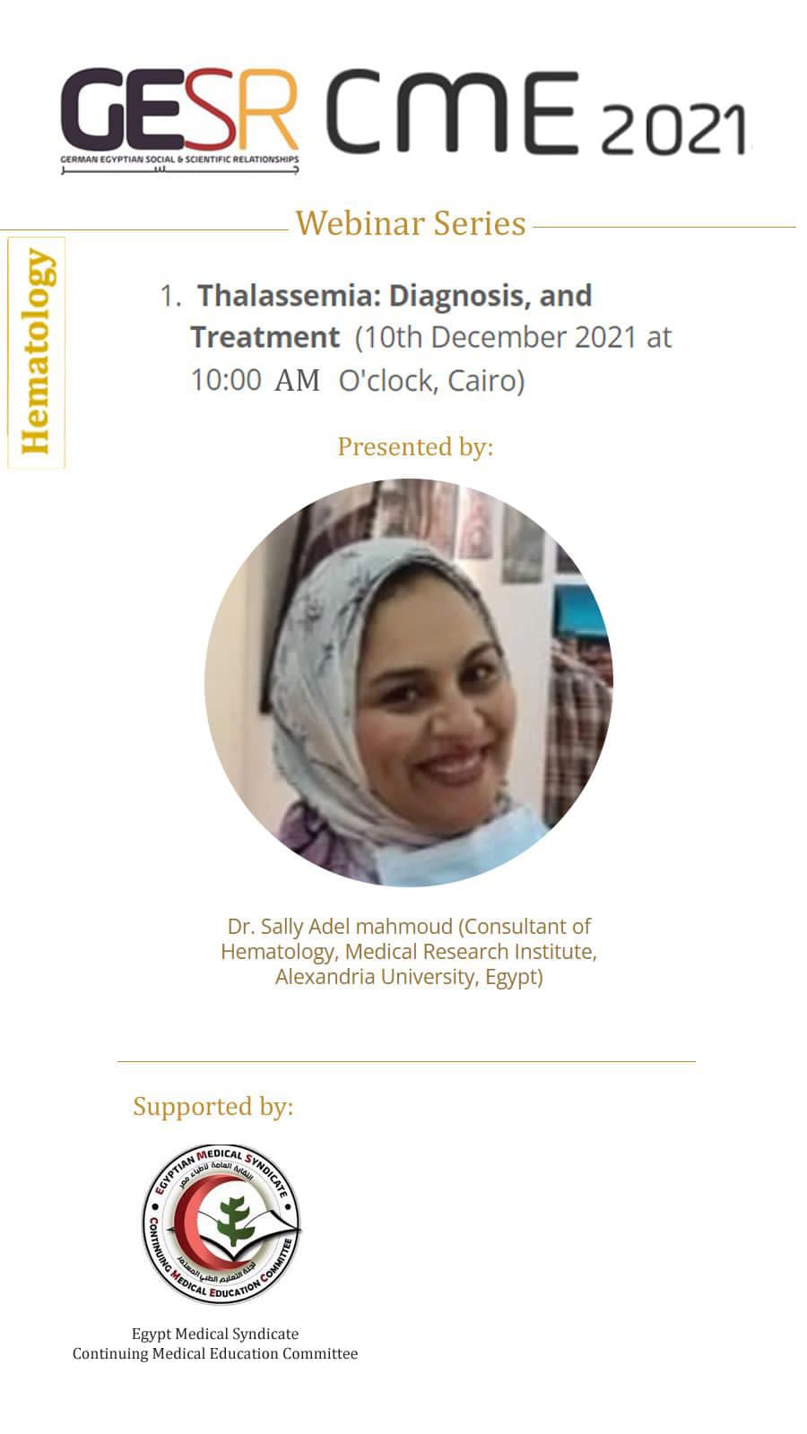 1- محاضرة التشخيص وعلاج الثلاسيميا: يوم الجمعة 10 ديسمبر 10 ص بتوقيت القاهرة، الدكتور سالي عادل محمود، قسم أمراض الدم بمعهد البحوث الطبية - جامعة الإسكندرية.
