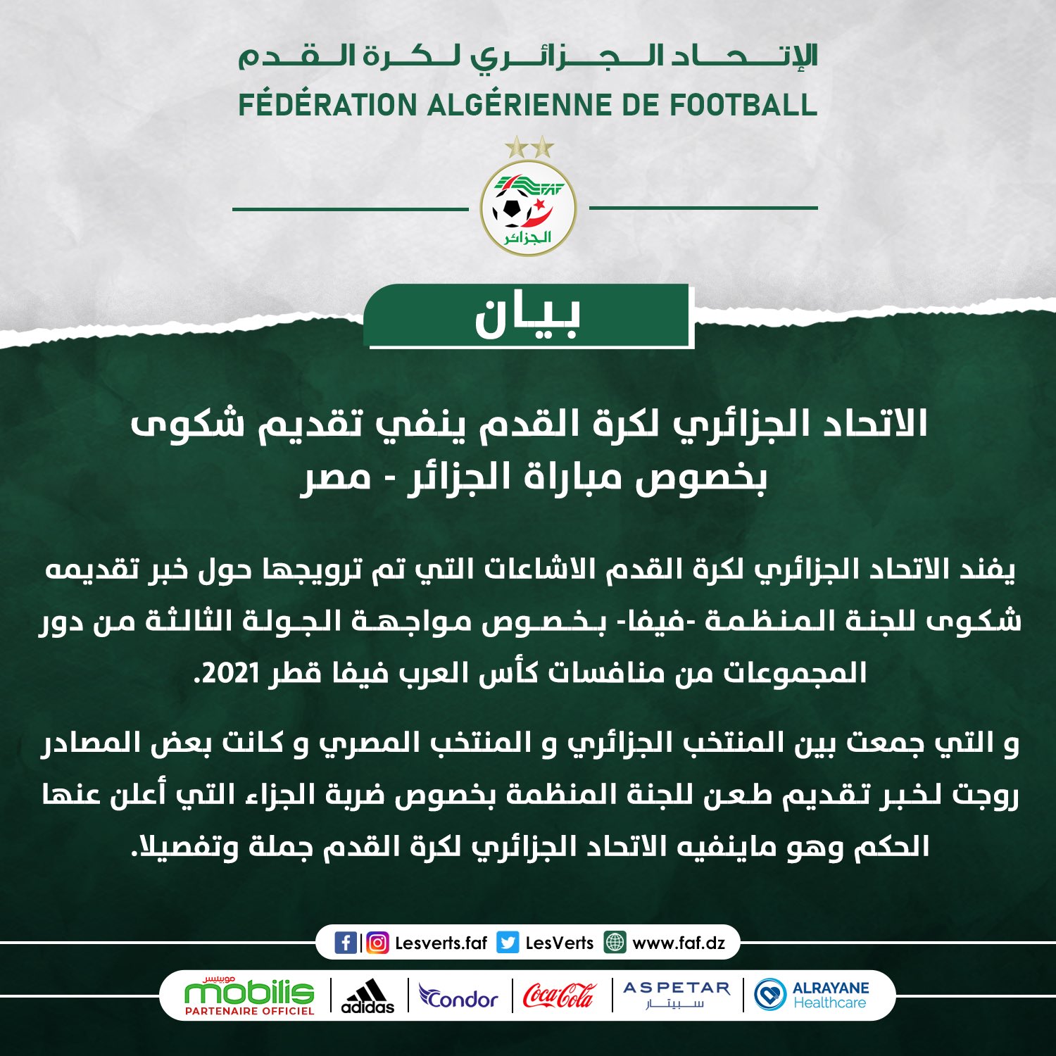 وقال المنتخب الجزائري في بيان رسمي منذ قليل، عبر حسابه على موقع التواصل الاجتماعي تويتر: يفند الاتحاد الجزائري لكرة القدم الإشاعات؛ التي تم ترويجها حول خبر تقديمه شكوى للجنة المنظمة - فيفا - بخصوص مواجهة الجولة الثالثة من دور المجموعات من مُنافسات كأس العرب ضد منتخب مصر.