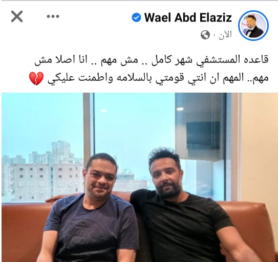 وعلق وائل عبد العزيز على الصورة قائلا: قاعدة المستشفى شهر كامل.. مش مهم، أنا أصلا مش مهم.. المهم إن أنت قومتي بالسلامة واطمنت عليكي.