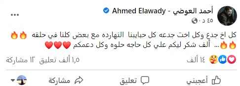 وكتب أحمد العوضي عبر حسابه الشخصي بموقع التواصل الاجتماعي فيسبوك: كل أخ جدع وكل أخت جدعة كل حبايبنا النهاردة مع بعض كلنا في حلقة، ألف شكر ليكم على كل حاجة حلوة وكل دعمكم.