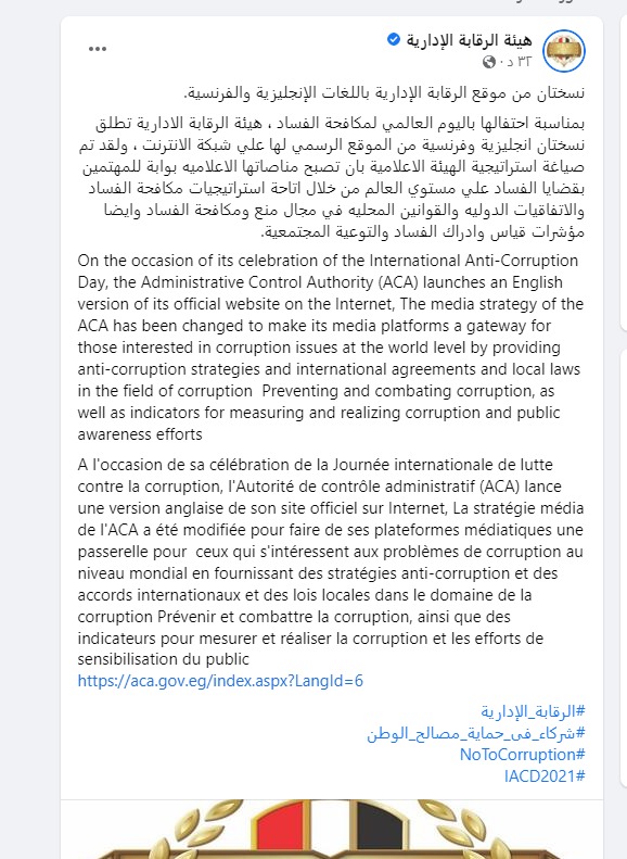 نشرت هيئة الرقابة الإدارية على صفحتها الرسمية بموقع التواصل الاجتماعي فيسبوك بيان نصه، بمناسبة احتفالها باليوم العالمي لمكافحة الفساد، هيئة الرقابة الإدارية تطلق نسختين انجليزية وفرنسية من الموقع الرسمي لها علي شبكة الإنترنت، وتم تغيير استراتيجية الهيئة الإعلامية بأن تصبح منصاتها الإعلامية بوابة للمهتمين بقضايا الفساد على مستوى العالم من خلال إتاحة استراتيجيات مكافحة الفساد والاتفاقيات الدولية والقوانين المحلية في مجال منع ومكافحة الفساد، وأيضا مؤشرات قياس وادراك الفساد والتوعية المجتمعية.
