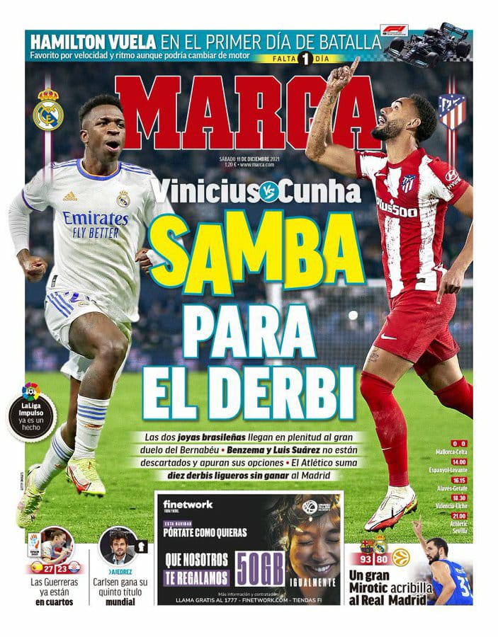 عنونت ماركا غلافها الرئيسي اليوم بالعنوان، كونها ضد فينيسيوس.. السامبا في الديربي، في إشارة إلى الحضور البرازيلي في المباراة الكبيرة التي ستلعب على البرنابيو.