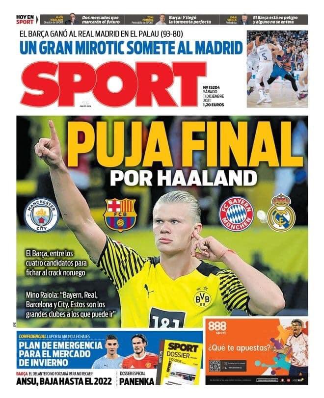 تصدر العنوان عرض نهائي لهالاند، غلاف سبورت لعدد اليوم، وذلك في إشارة إلى أن برشلونة ومانشستر سيتي وبايرن وريال مدريد على خط المواجهة لمحاولة الفوز بالمهاجم النرويجي.