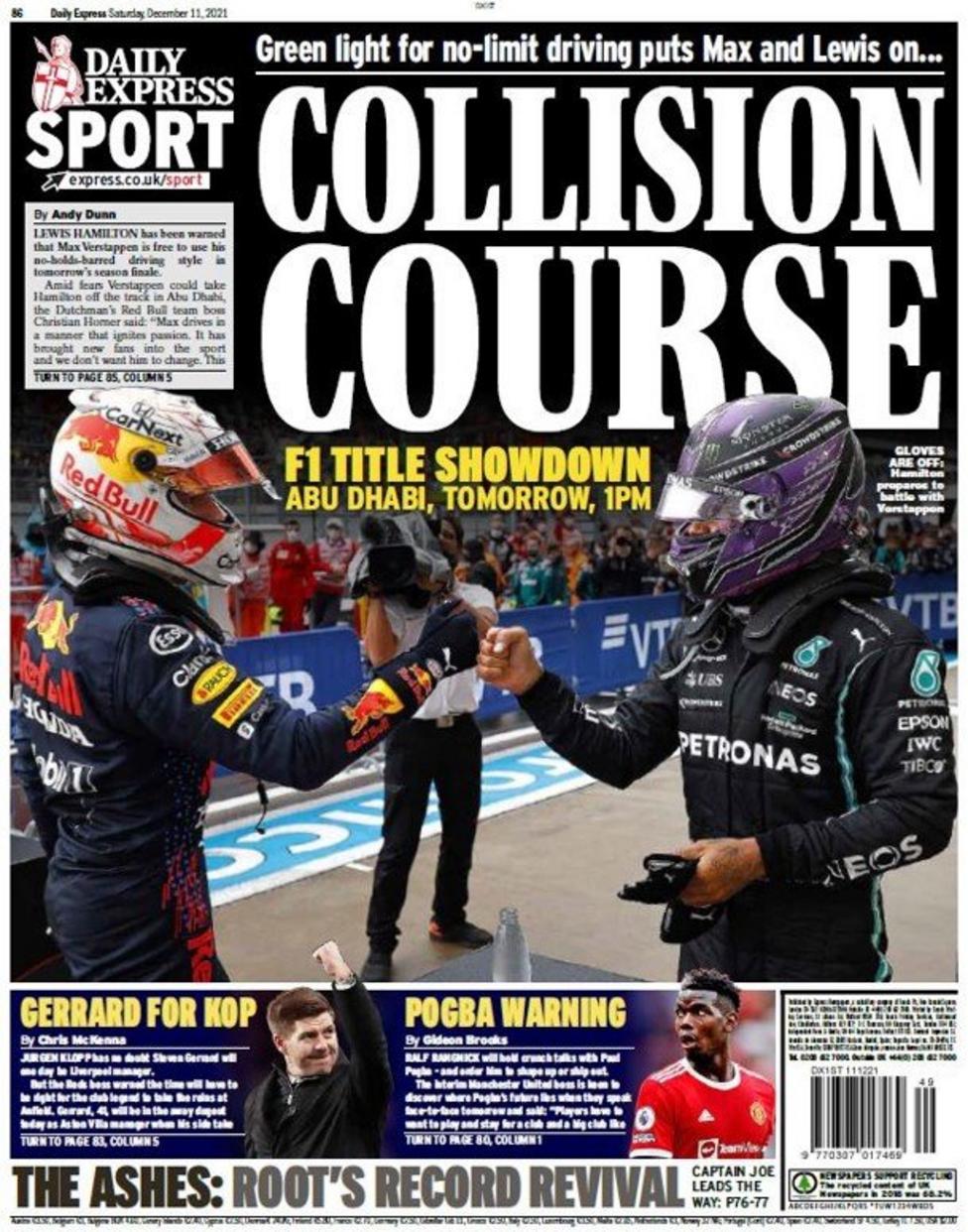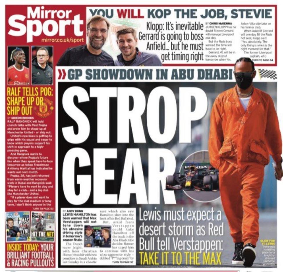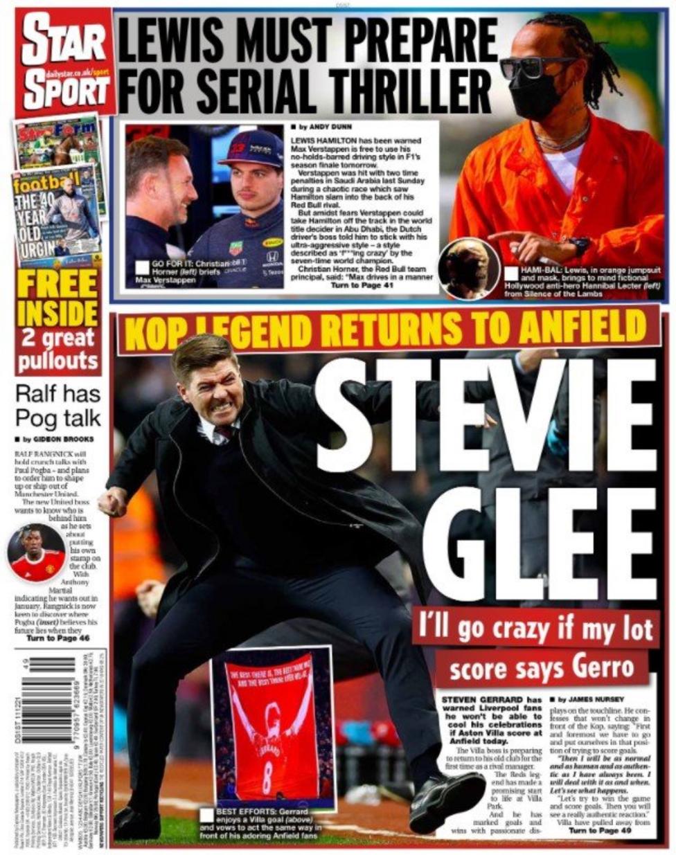 تصدر عنوان كلوب من أجل المجد غلاف الصحيفة، وذلك في إشارة إلى أن اليوم سيشهد رغبة جيرارد للمرة الأولى في خسارة ليفربول حينما يلتقيان في الدوري.