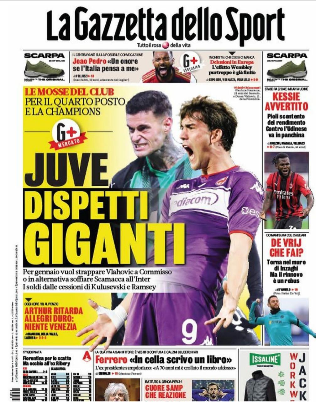 سلطت لا جازيتا الضوء في غلافها على ميركاتو فريق يوفنتوس، وذلك تحت عنوان يوفنتوس ومضايقات الكبار، البيانكونيري يدخل الصراع على ضم فلاهوفيتش وسكاماكا.