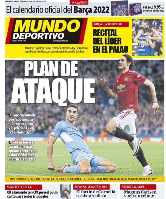 عنونت موندو ديبورتيفو الإسبانية غلافها الرئيسي بالعنوان أولوية تدعيم، حيث تؤكد الصحيفة أن أولوية نادي برشلونة في التوقيع مع فيران توريس وكافاني لتعزيز الفريق في منافسات الدور الثاني من الدوري.