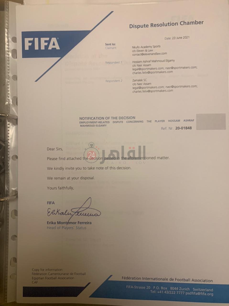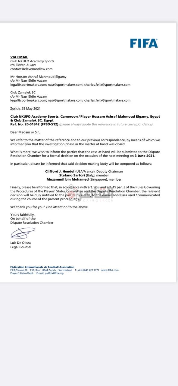 البند رقم 10 - في 18 ديسمبر 2020 تقدمت الاكاديمية الكاميرونية بشكوى إلى الفيفا تختصم اللاعب ونادي الزمالك.