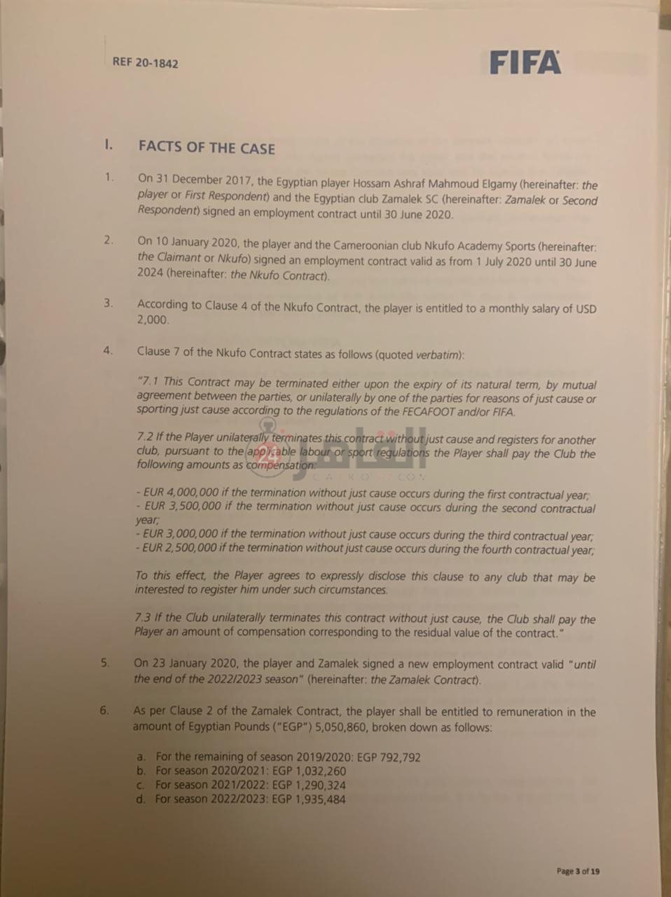 البند رقم 7 - في 6 فبراير 2020 وبعد العلم بتوقيع اللاعب عقد مع نادي الزمالك اجري وكيل الاكاديمية الكاميرونية اتصال باللاعب ووالد اللاعب من خلال تطبيق واتساب لإخطارهم بأنه بموجب تفعيل العقد الموقع بين اللاعب والأكاديمية الكاميرونية فان توقيع اللاعب لنادي الزمالك يضع اللاعب في مخالفة التوقيع لناديين.