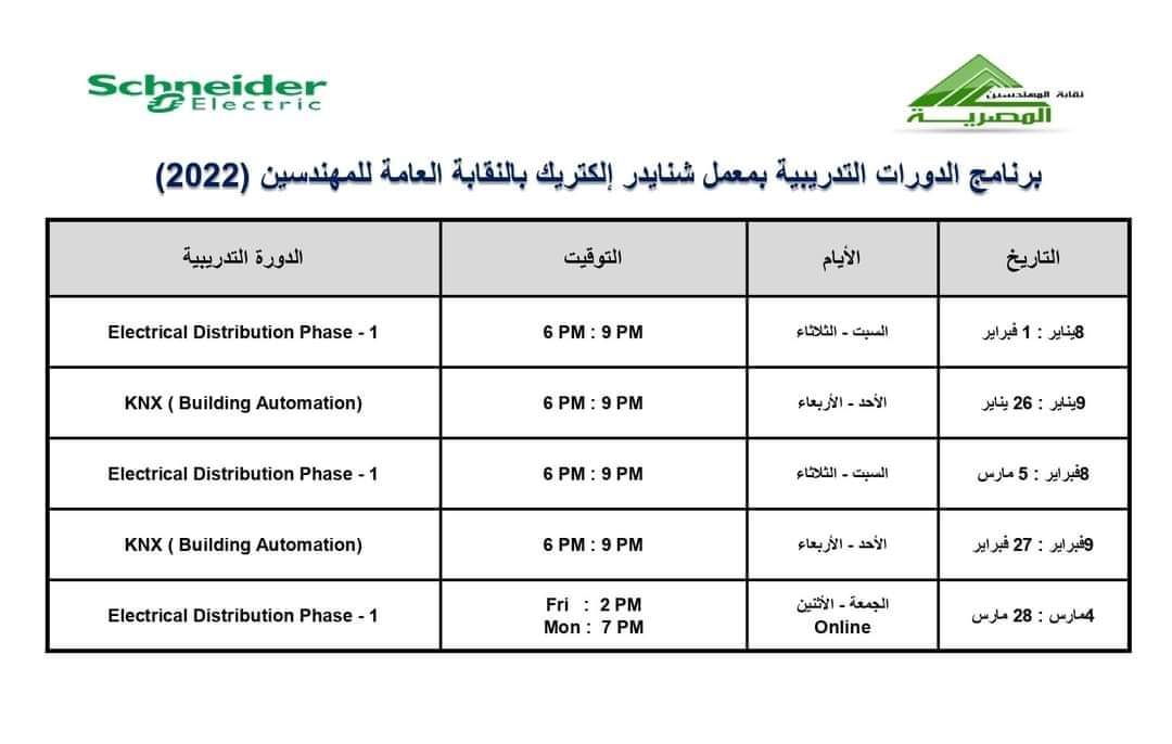 أعلنت النقابة العامة للمهندسين، فتح باب الحجز بالدورات المقدمة من معمل شنايدر إلكتريك بالنقابة لعام 2022، على النحو التالي: