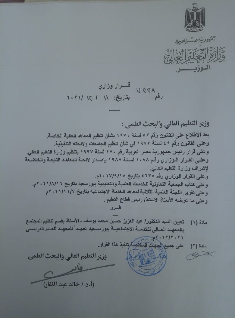 اصدر الدكتور خالد عبد الغفار، وزير التعليم العالى والبحث العلمى، قرار 7228، لسنة 2021، بتعيين الدكتور عبد العزيز حسين محمد يوسف، الاستاذ بقسم تنظيم المجتمع بالمعهد العالى للخدمة الاجتماعية ببورسعيد، عميدا للمعهد للعام الدراسى 2021- 2022.