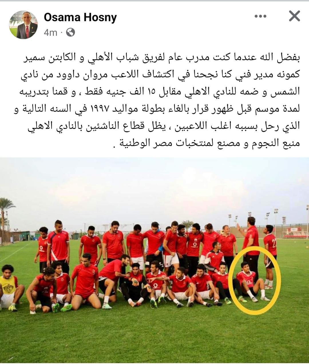 وأضاف نجم الأهلي السابق خلال منشور عبر صفحته الرسمية على موقع التواصل الاجتماعي فيس بوك: نجحنا في ضم مروان داوود للنادي الأهلي مقابل 15 ألف جنيه فقط، وقمنا بتدريبه لمدة موسم قبل ظهور قرار بإلغاء بطولة مواليد 1997 في السنة التالية، والذي رحل بسببه أغلب اللاعبين.