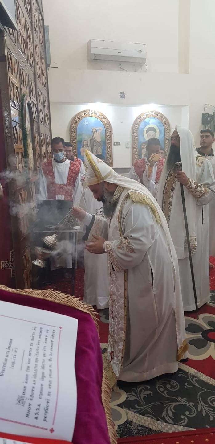 وخلال صلوات القداس الإلهي قام نيافته بمشاركة القس يحنس القمص يوسف؛ كاهن الكنيسة كما قام نيافته بتدشين عدد من الأيقونات وأواني المذبح.