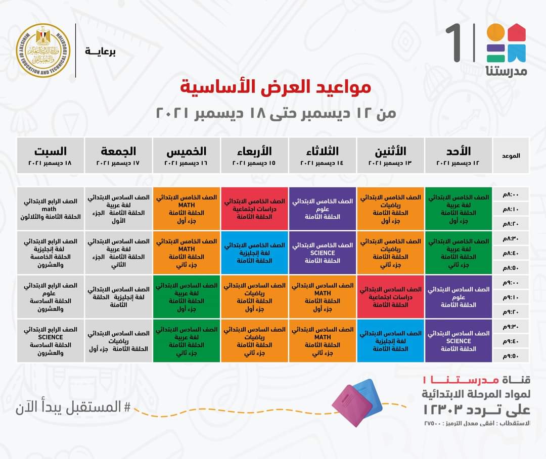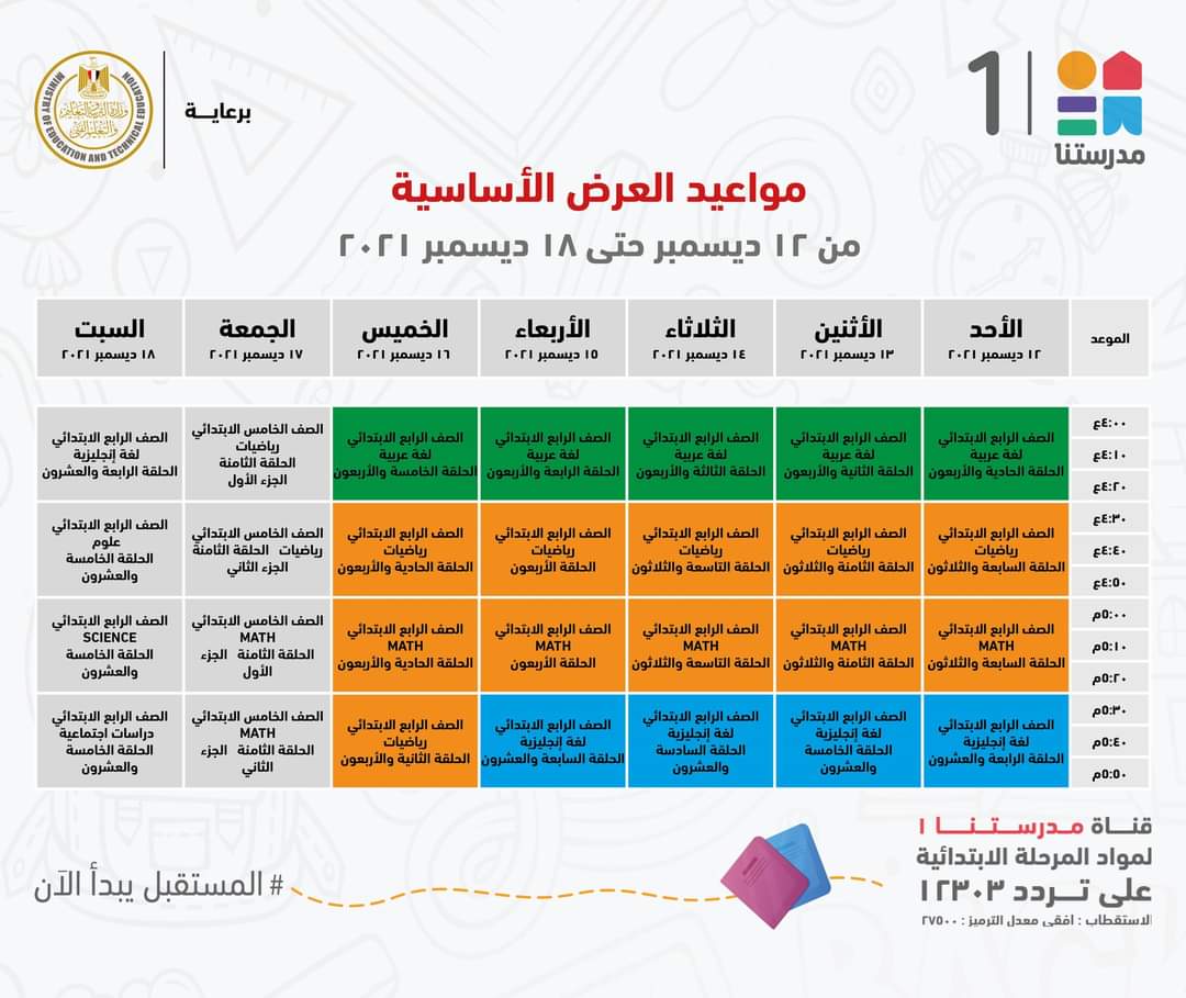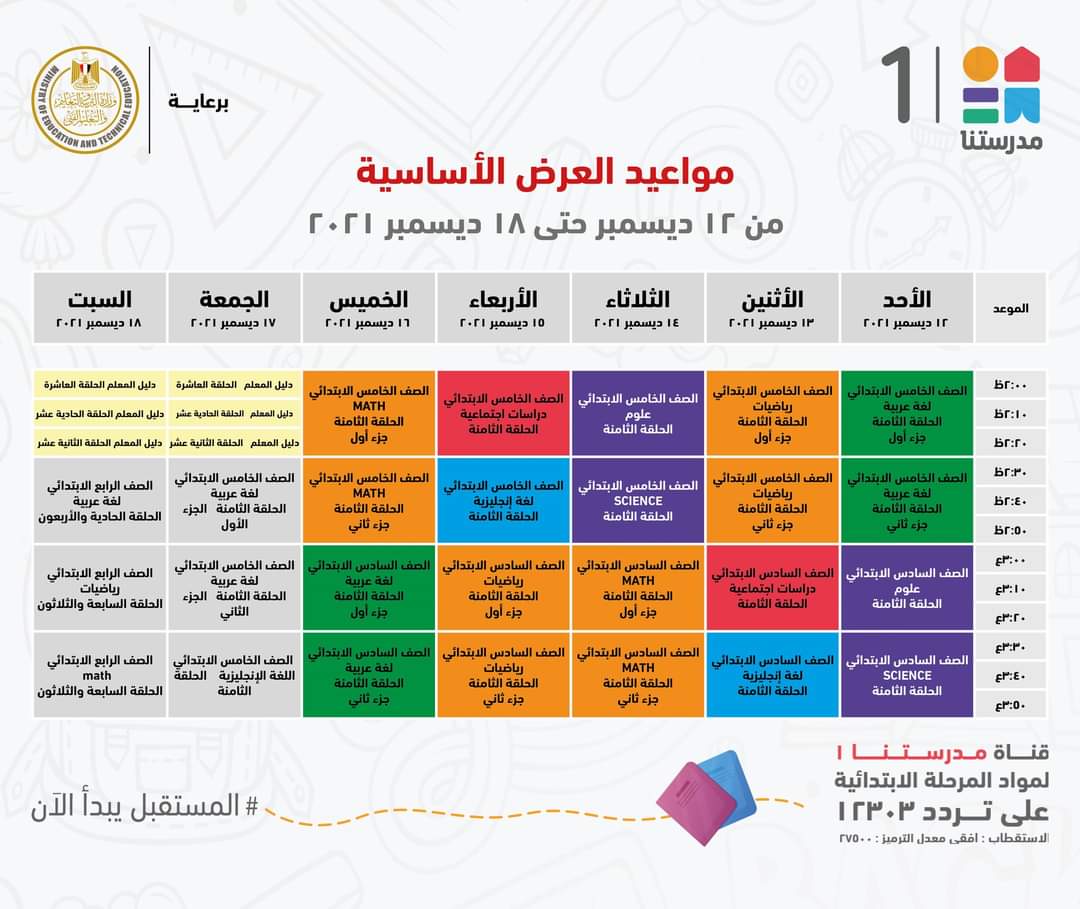 أعلنت قناة مدرستنا 1 التابعة لوزارة التربية والتعليم، للطلاب وأولياء أمور عن مواعيد عرض البرامج التعليمية للصفوف الابتدائية، باللغة العربية مع الإعادة، على قناة مدرستنا 1 من تاريخ 12-18 ديسمبر، مشيرة أنه يمكن المتابعة على التردد 12303 الاتي.