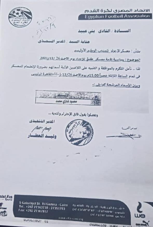 بشأن معسكر المنتخب الوطني الأوليمبي، وبمناسبة إقامة معسكر مغلق للمنتخب والإعداد يوم الأحد الموافق 26 ديسمبر الجاري، نأمل بالتكرم بالموافقة والتنبيه على اللاعبين الآتية أسماؤهم لضرورة الانضمام إلى معسكر المنتخب في الثالثة عصرًا، الأحد الموافق 26 من ديسمبر.