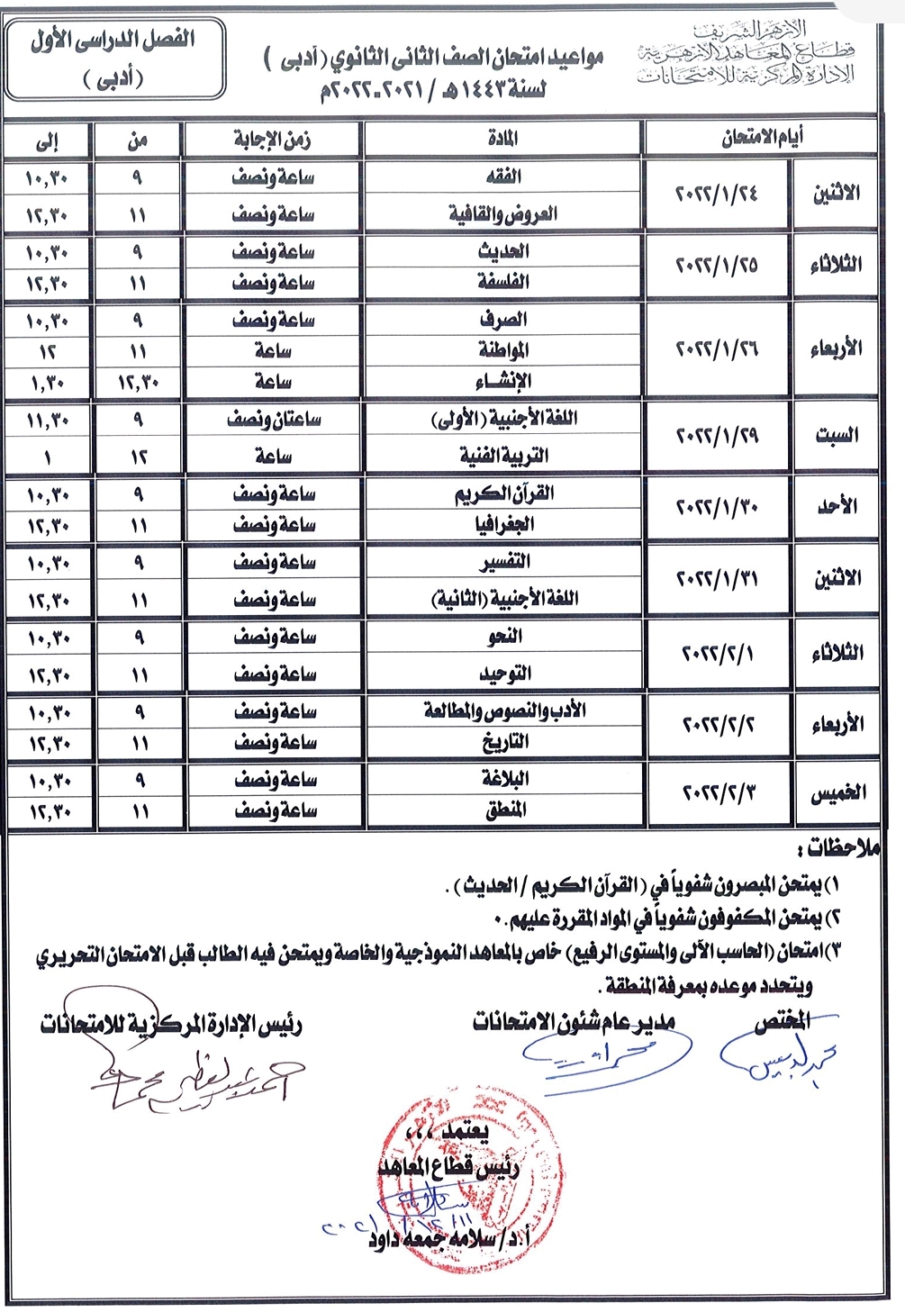 وحدد قطاع المعاهد الأزهرية موعد بدء امتحانات الصف الأول الثانوي الأزهري علمي وأدبي، وامتحانات الصف الثاني الثانوي علمي وأدبي، يوم الإثنين الموافق 24 / 1 / 2022 وتنتهي يوم الخميس الموافق 3 / 2 / 2022.