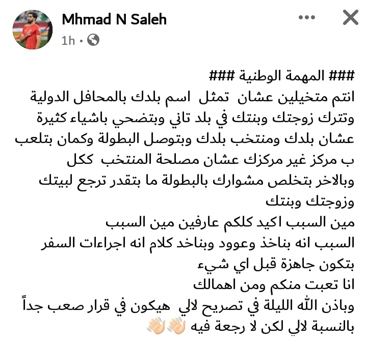 ونشر لاعب المنتخب الفلسطيني ومدافع القناة، عبر صفحته على موقع التواصل الاجتماعي فيسبوك منشورًا جاء فيه: المهمة الوطنية.. أنتم متخيلين عشان تمثل اسم بلدك بالمحافل الدولية، وتترك زوجتك وبنتك في بلد تاني وبتضحي بأشياء كثيرة عشان بلدك ومنتخب بلدك وبتوصل البطولة وكمان بتلعب بمركز غير مركزك عشان مصلحة المنتخب ككل.