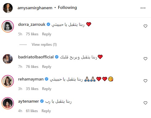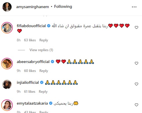 فيما وجهت الفنانة فيفي عبده رسالة دعم لإيمي، حيث أوضحت: ربنا يتقبل عمرة مقبولة إن شاء الله، أما الفنانة بدرية طلبة قالت: ربنا يتقبل ويريح قلبك، بينما دعمت ريهام حسن قائلة: ربنا يتقبل يا حبيبتي.