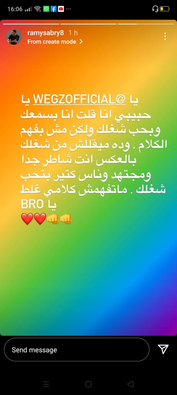 وكتب رامي صبري، عبر خاصية ستوري على حسابه الشخصي بموقع تبادل الصور والفيديوهات الشهير انستجرام: یا ويجز یا حبيبي أنا قلت أنا بسمعك وبحب شغلك ولكن مش بفهم الكلام.. وده ميقللش من شغلك بالعكس أنت شاطر جدا ومجتهد وناس كتير بتحب شغلك.. ماتفهمش كلامي غلط یا اخويا.