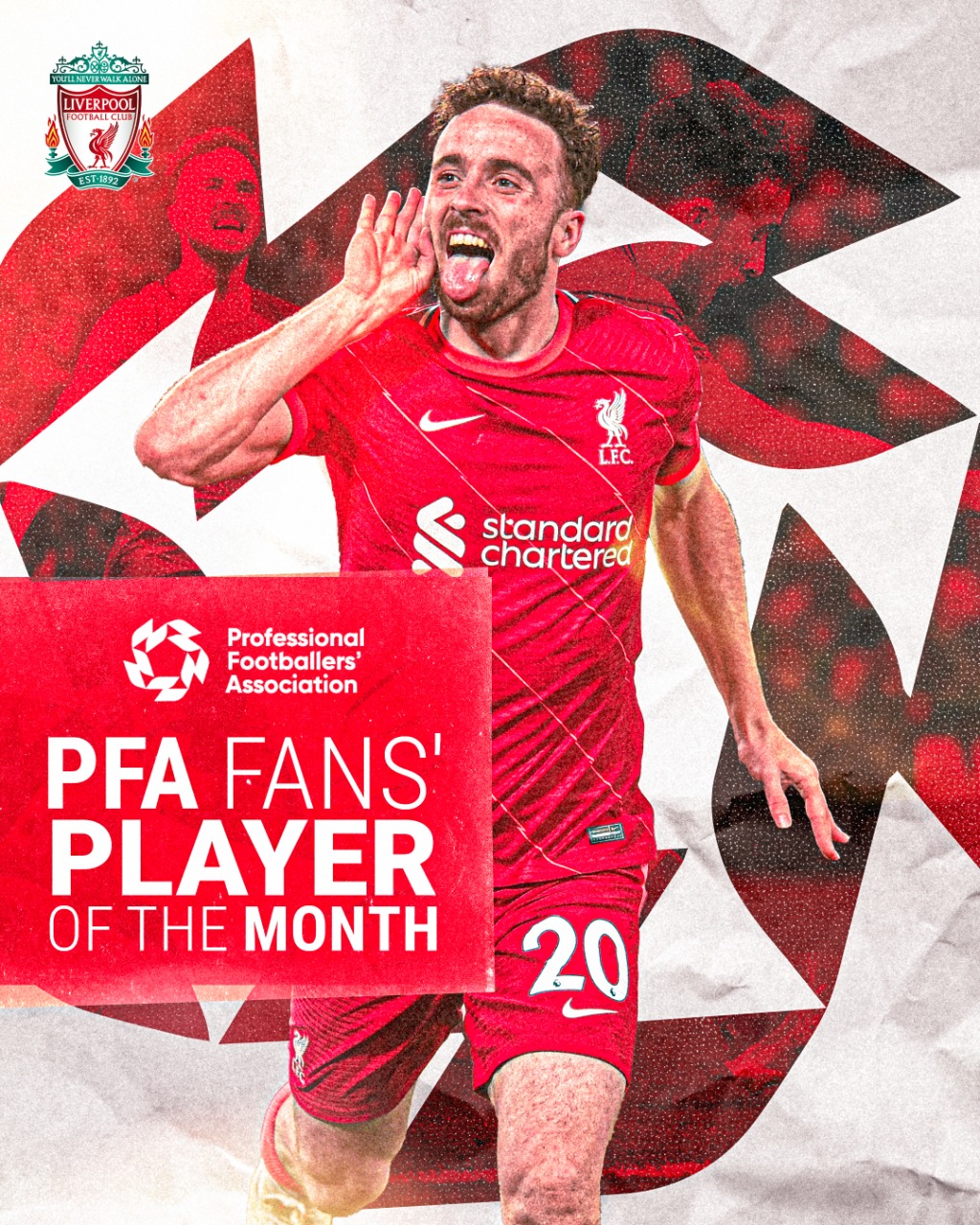 وحقق ديوجو جوتا أعلى نسبة من تصويت الجماهير، اليوم الثلاثاء، كأفضل لاعب لشهر نوفمبر لاتحاد لاعبي كرة القدم المحترفين PFA في الدوري الإنجليزي الممتاز للموسم الكروي الحالي 2021-2022، حيث سجل مهاجم ليفربول في الشهر الماضي 3 أهداف، واحدا منهم في فوز الريدز 4-0 على أرسنال، في الجولة 12 من المسابقة.