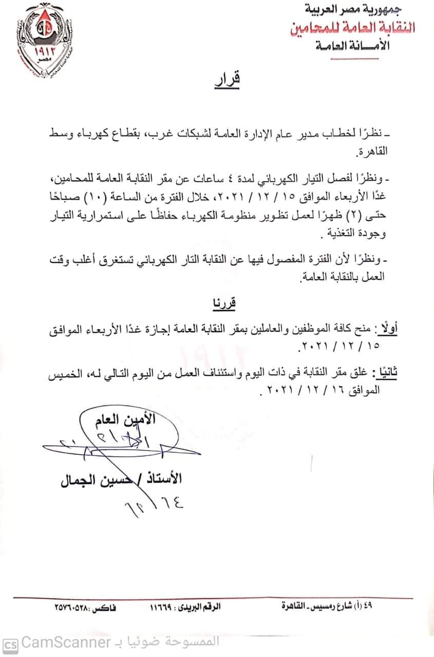 أصدرت الأمانة العامة بنقابة المحامين، برئاسة الأمين العام حسين الجمال اليوم، قرارًا باعتبار غدًا الأربعاء إجازة بمقر النقابة العامة، وغلق المقر، نظرًا لفصل التيار الكهربائي لمدة 4 ساعات، لأعمال تطوير منظومة الكهرباء.