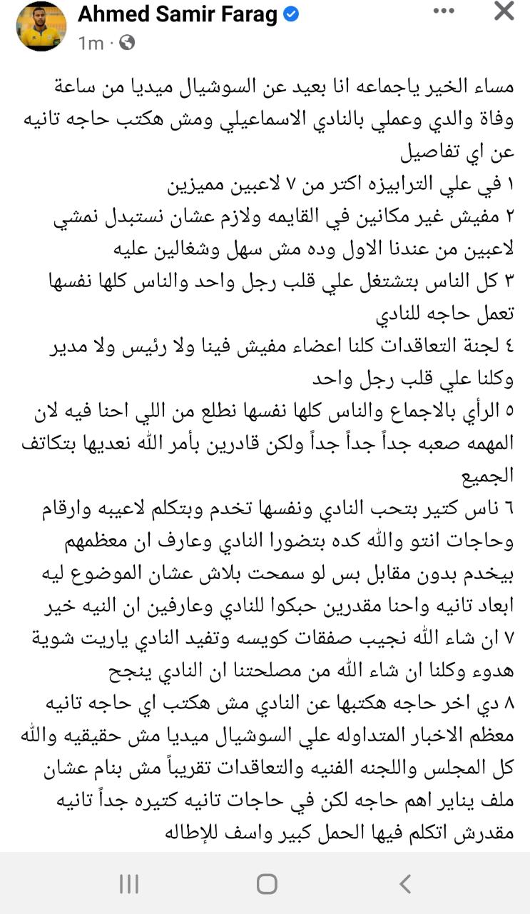 واختتم: إن إدارة الإسماعيلي تحتاج إلى المساندة من الجميع وهناك محاولات لاستبدال بعض اللاعبين من القائمة الحالية للفريق ومحاولة قيد اللاعبين الجدد في حالة الاتفاق معهم وسيتم الإعلان عن كل شيء خلال الساعات القليلة القادمة