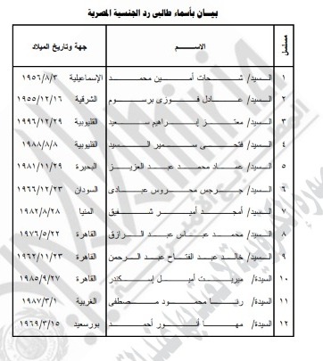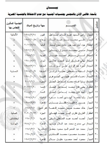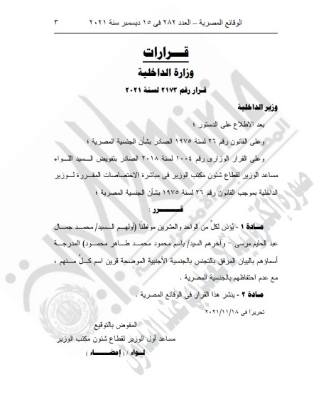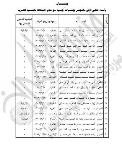 ونشرت الجريدة الرسمية في عددها الصادر اليوم المادة 1: يؤذن لكل من الواحد والعشرين مواطنا بالبيان المرفق بالتجنس بالجنسية الأجنبية الموضحة قرين اسم كل منهم، مع عدم احتفاظهم بالجنسية المصرية.